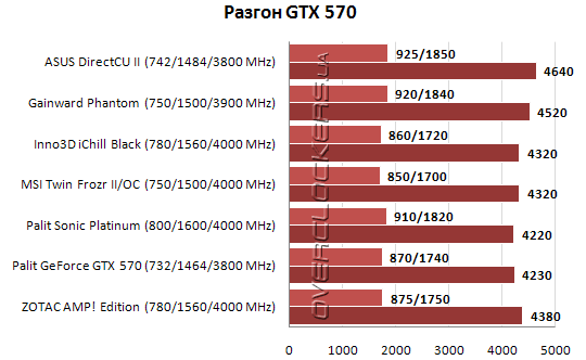 Лучший разгонный потенциал GPU у видеокарт ASUS, Gainward Phantom и Palit Sonic. Но последняя оказалась хуже всех по разгону памяти. В тоже время «близнец» от Gainward легко перешагнул рубеж в 5 ГГц. Все остальные видеокарты референсного дизайна с двумя обычными шестиштырьковыми разъемами питания не смогли достичь частоты ядра в 900 МГц. Среди них лучший результат у Zotac AMP с 875 МГц, худший у MSI с 850 МГц. Низкие результаты разгона у N570GTX Twin Frozr II/OC и Inno3D iChill GeForce GTX 570 Black связаны с недостаточно качественным охлаждением VRM.