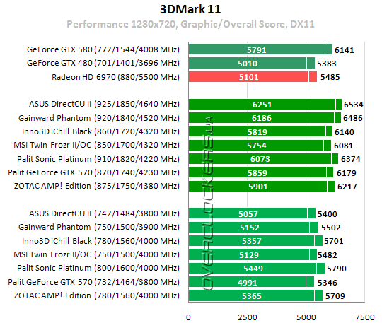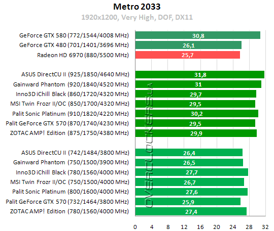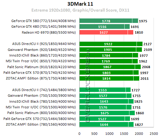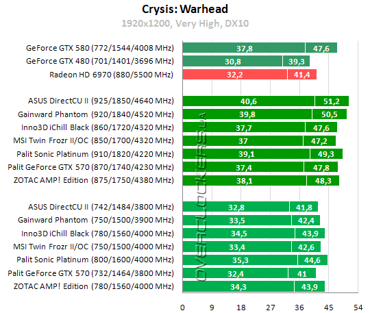 С разгоном все GeForce GTX 570 с частотой ядра от 870 МГц догоняют GeForce GTX 580. Карты от ASUS и Gainward даже обходят старшего брата на 5 и 3%.