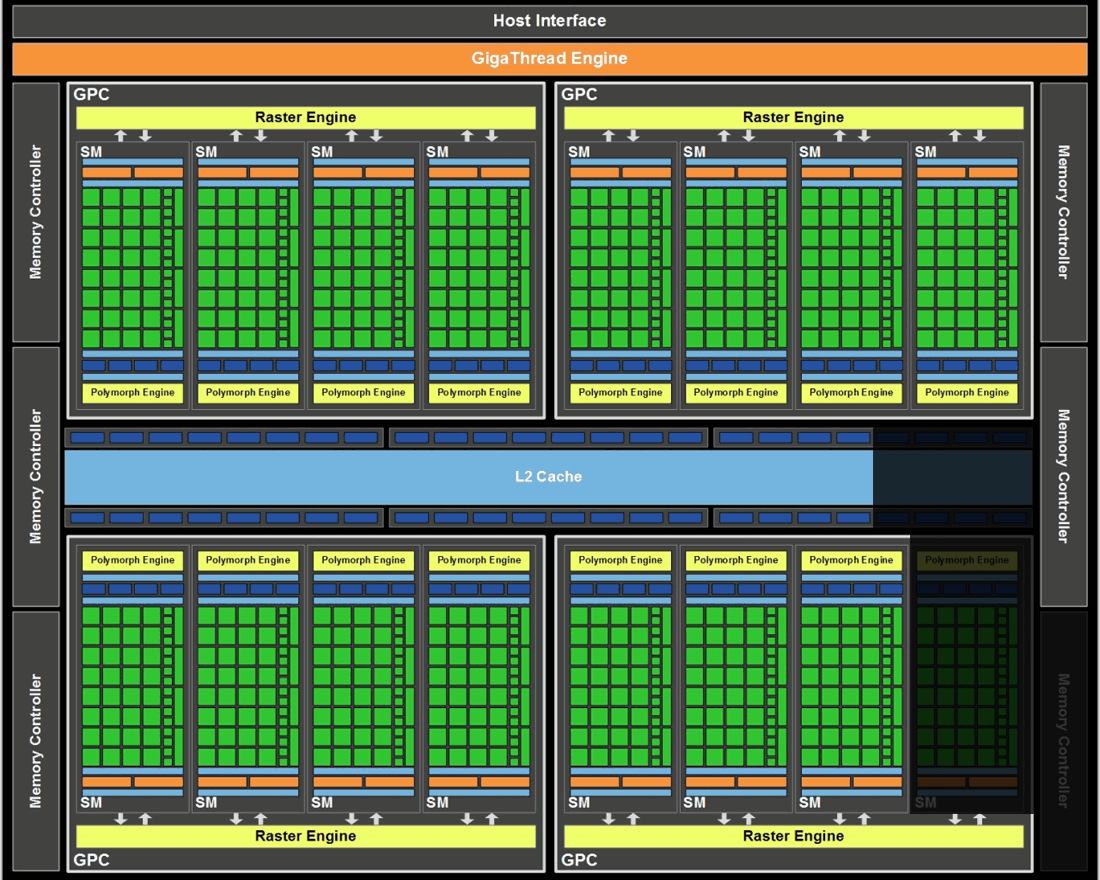Новичок напоминает сильно улучшенный GeForce GTX 470, который по своему потенциалу приближается к GeForce GTX 480. Упрощенный GPU частично компенсирует свои «узкие» места за счет более высоких частот — ядро работает на 732/1464 МГц. Память GDDR5 функционирует на 3800 МГц, что тоже немного выше, чем у старого флагмана, хотя 320-битная шина все же остается ограничивающим фактором.