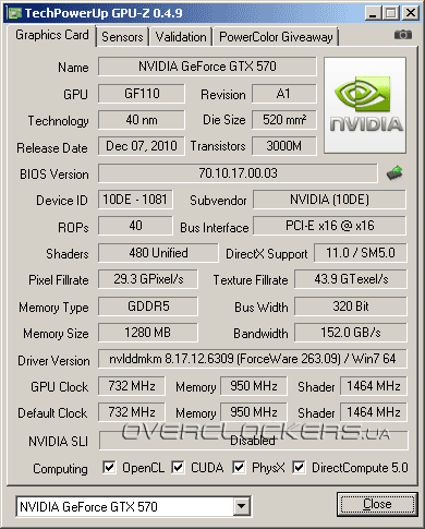 Новый видеоадаптер основан на графическом чипе GF110, который является обновленным и слегка улучшенным GF100. GeForce GTX 570 лишился одного мультипроцессора, так что в активе GPU уже 480 CUDA-ядер (как и у GeForce GTX 480). Соответственно и текстурных блоков у GeForce GTX 570 столько же, как и у старого флагмана, а именно 60. А вот блоков рендеринга стало меньше — 40, против 48 у GeForce GTX 480 и GeForce GTX 580. Объем кэш-памяти L2 уменьшился, что тоже должно сказаться на итоговой производительности, если сравнивать со старшими графическими ускорителями Fermi. Шина памяти урезана до 320 бит, а объем памяти уменьшен до 1280 мегабайт. Тут уже GeForce GTX 570 сравним со своим предшественником GeForce GTX 470.