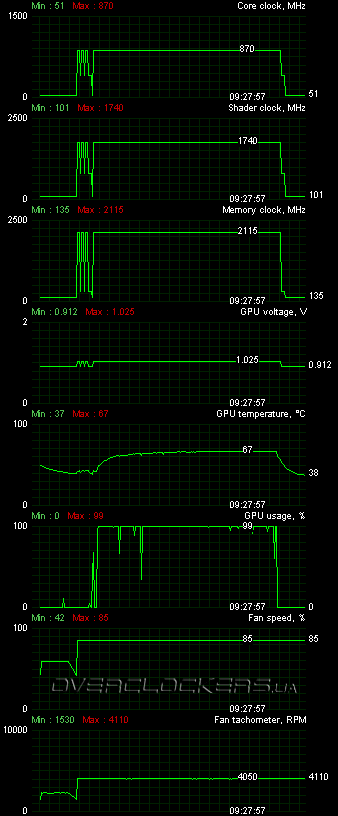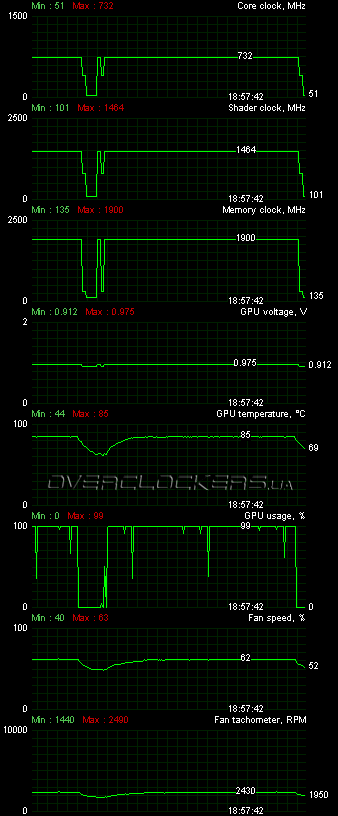 Стабильность при разгоне достигалась за счет повышенных оборотов вентилятора. Об акустическом комфорте говорить в таком случае не приходится. Для постоянного использования видеоадаптера в таком режиме не обойтись без замены системы охлаждения.