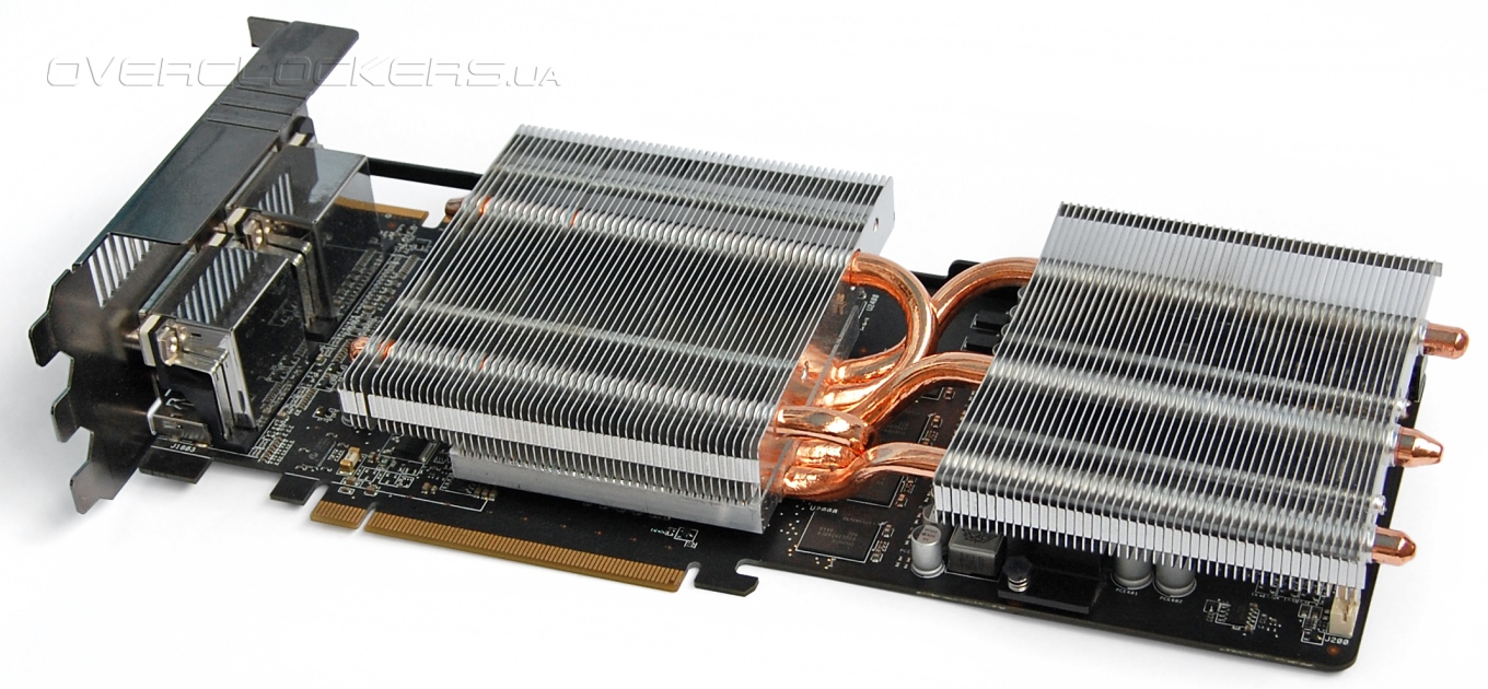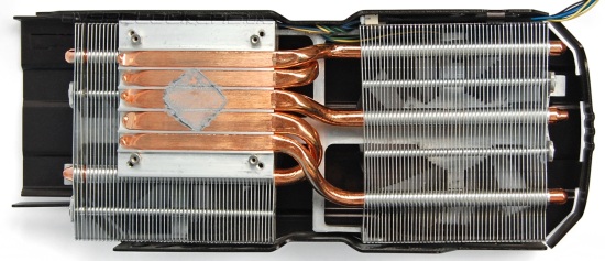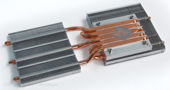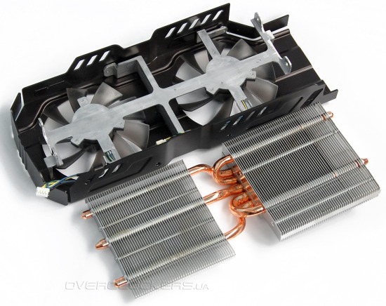 Несмотря на внушительный внешний вид всей конструкции, основной объем занимают два больших вентилятора. Радиатор тонкий и небольшой. Зато он включает пять тепловых трубок, которые напрямую контактируют с поверхностью графического процессора.