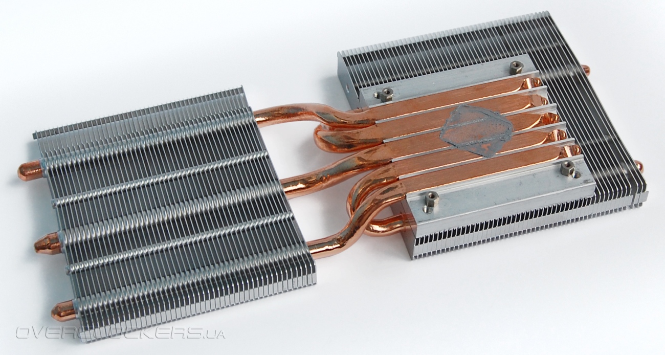 Вот так скромненько выглядит радиатор на фоне платы без своего кожуха с вентиляторами.