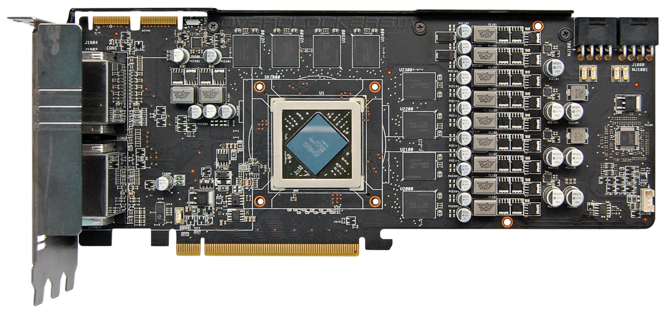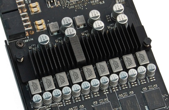 Преобразователь напряжения графического процессора включает 16 фаз — восемь линий по два канала под управлением ASP0A13.