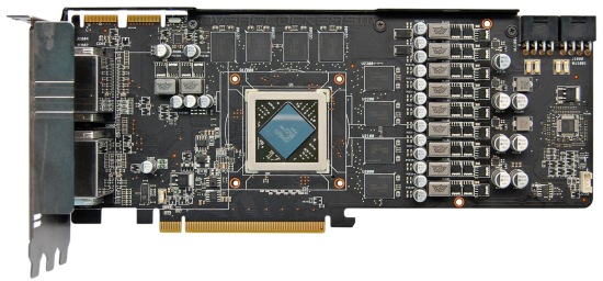 Дизайн платы Matrix GTX580 P/2DIS/1536MD5 кардинально отличается от референсного. Система питания занимает половину платы. Задействовано два восьмиконтаткных разъема питания.