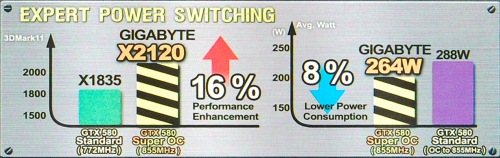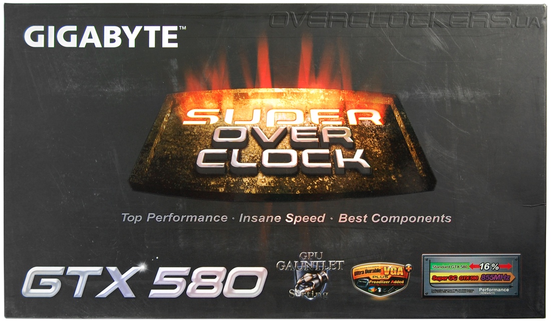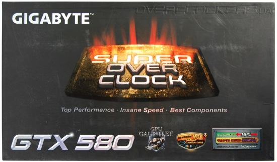 Соотношение частот ядра и памяти подобрано для достижения максимального прироста производительности. Судя по картинке на коробке, Gigabyte GV-N580SO-15I должен быть быстрее референса на целых 16% при преимуществе в 11% по частоте GPU и в 2,3% по частоте памяти. И как вы сами отлично понимаете, при таком заводском разгоне реальная разница в производительности будет меньше заявленной цифры.