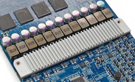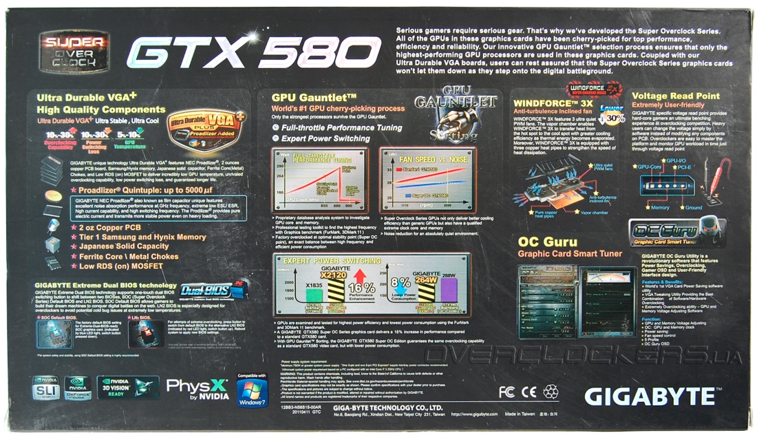Видеокарта выполнена по внутреннему стандарту компании Ultra Durable VGA+, что подразумевает производство платы с удвоенной толщиной медных проводников и применение высококачественных компонентов. Согласно заявлению производителя, графические процессоры для видеокарт серии SOC отбираются исходя из самого лучшего сочетания разгонного потенциала и умеренного энергопотребления. И все это обеспечивает более низкое энергопотребление в сравнении со стандартным адаптером GeForce GTX 580, разогнанным до таких же частот. Но это, опять же, со слов Gigabyte, и без озвучивания каких-то конкретных цифр по напряжению у референсного решения.