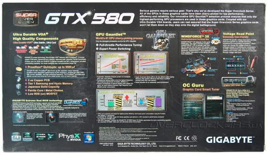 Коробка Gigabyte GV-N580SO-15I имеет традиционное исполнение, характерное для всех топовых видеокарт компании. Черный цвет, большой логотип Super Overclock и подробное описание технических преимуществ и особенностей изделия на обратной стороне. Само название серии предполагает повышенные частоты и улучшенные возможности для разгона. Обеспечивается это не только усовершенствованным дизайном PCB и эффективным охлаждением, но и благодаря отбору лучших графических процессоров. Хотя, как показывает наш опыт общения с видеокартами данной серии, такой отбор не всегда дает реальные преимущества над всеми конкурентами.