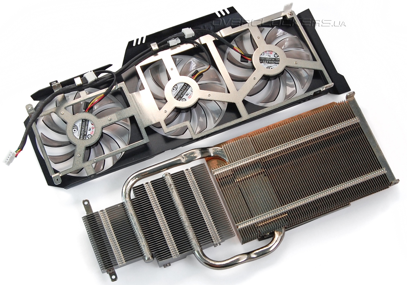 Вентиляторы крепятся к небольшой металлической рамке, которая прикручивается к радиатору. Используются три вентилятора Power Logic PLD08010S12M диаметром 80 мм. Расположены они не в одной плоскости, а под небольшим углом друг к другу. Крайние вентиляторы наклонены к центру. Такая особая конструкция является отличительной чертой кулеров WindForce. Это помогает исключить турбулентные завихрения и улучшить общую продуваемость радиатора.