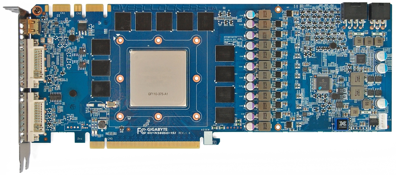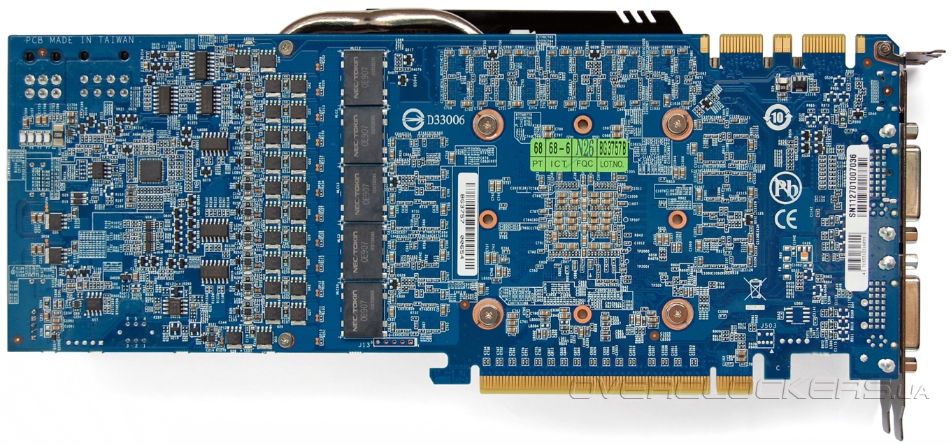 Дизайн платы кардинально отличается от рефенсного. За основу взят GV-N480SO-15I, флагман прошлой серии. Обе стороны платы испещрены элементами.