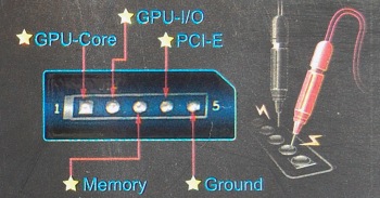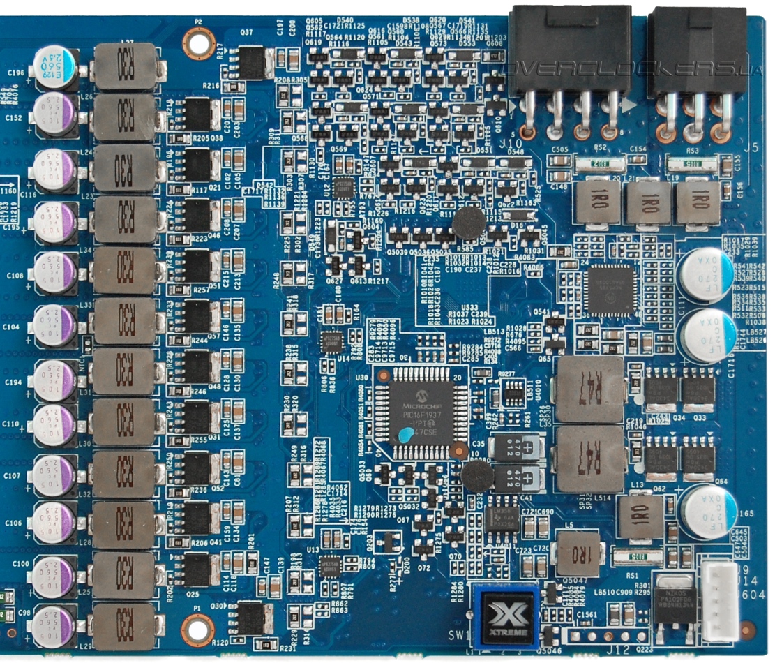 Питание графического процессора реализовано на шестифазном контроллере ADP4100 ON Semiconductor, который в сочетании с тремя uP6275AD обеспечивает 12 линий. На лицевой стороне платы распложен микроконтроллер PIC16F1937, который отвечает за аппаратную реализацию широких возможностей по мониторингу и управлению рабочих параметров видеокарты с помощью утилиты Gigabyte OC Guru. В схеме фильтрации выходных напряжений используются пленочные конденсаторы Proadlizer NEC/TOKIN с низким эквивалентным последовательным сопротивлением ESR. Кстати, на верхнем изображении, под Proadlizer вы можете увидеть группу контактов J13. Это точки замера рабочих напряжений. Сделано не очень удобно, особенно, если вспомнить, как это реализовано у MSI — отдельные разъемы, переходники под щупы мультиметра. А тут даже не подписано, какие точки какому параметру соответствуют. Хотя картинка-инструкция присутствует на коробке.