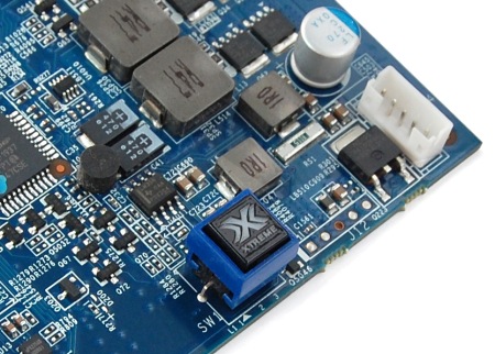 Из особенностей видеокарты стоит еще отметить наличие двойного BIOS, который переключается специальной кнопкой. Доступ к кнопке весьма проблематичен, но реально она может понадобиться только при экстремальном разгоне с использованием жидкого азота, когда все будет собрано на открытом стенде, а родная система охлаждения будет снята. Дополнительный BIOS как раз и рассчитан на такой режим, и его микрокод оптимизирован под разгон при сверхнизких температурах. В обычном режиме кнопка подсвечивается голубым цветом, при переключении на «экстремальный» BIOS — красным.
