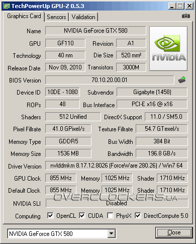 Более высокие рабочие частоты требуют и повышенного напряжения, но в данном случае оно уж слишком высокое — 1,075 В. Для сравнения референс работает на 1,0 В. Из-за такого высокого напряжения и повышенных частот Gigabyte GV-N580SO-15I оказывается немного шумным. В игровом режиме скорость вращения вентиляторов доходит почти до 3000 об/мин. Зато температура GPU остается низкой — не более 73 °C в нашем стандартном 12-минутном тесте Crysis: Warhead при максимальных настройках качества графики со сглаживанием (в помещении 22,5 °C).