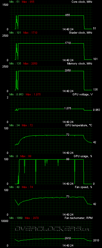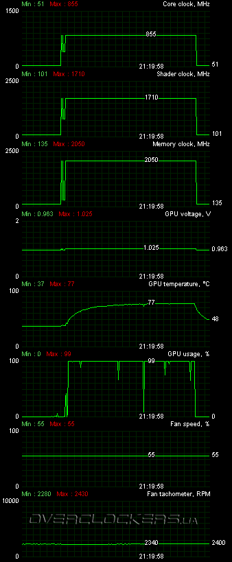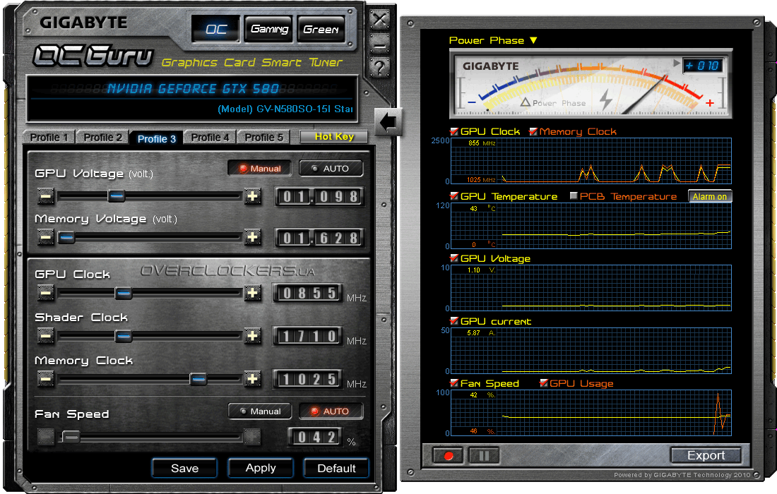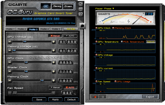Прежде чем переходить к результатам разгона стоит отметить, что для этих целей кроме популярной утилиты MSI Afterburner можно использовать фирменную программу Gigabyte OC Guru, которая поддерживает все возможности, реализованные в GV-N580SO-15I. В частности, кроме контроля и регулирования напряжения GPU есть еще возможность изменения напряжения памяти (до +1,65 В).