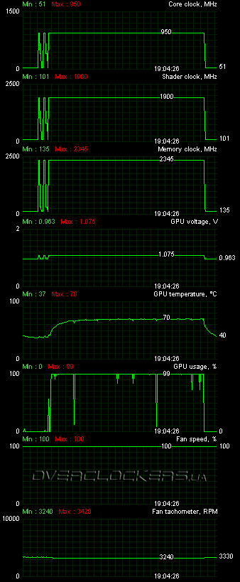 Для начала мы решили найти максимальные стабильные частоты при высоких оборотах обдувающих вентиляторов. Этим максимумом оказались 950/1900 МГц для ядра и 4690 МГц для памяти GDDR5. При этом самым оптимальных напряжением для таких частот стали номинальные 1,075 В. Это лишний раз говорит о том, что производитель погорячился с таким напряжением для карты. Хотя, возможно, это сделано специально, чтобы можно было максимально раскрыть частотный потенциал адаптера.