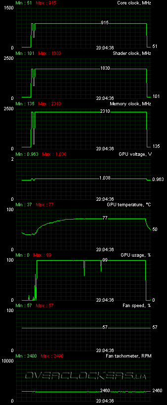Все эти высокие цифры хороши, но не стоит забывать и о более практичном разгоне. Ведь при максимальных оборотах и высоком шуме комфортно не поиграешь за компьютером. Какие же частоты доступны данной карте в более адекватном и тихом режиме? Оказалось, не намного ниже максимальных. Поиграв с разными частотами и напряжениями мы добились стабильности на частотах 915/1830/4620 МГц при напряжении 1,038 В и 2460 об/мин.