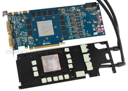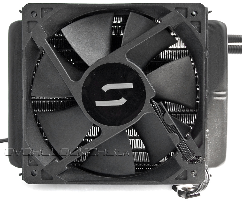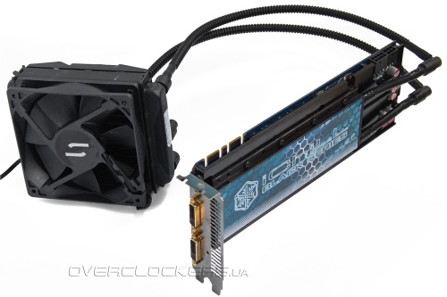 Видеокарта накрыта водоблоком, от которого тянутся трубки с поворотными фитингами на концах, что позволяет менять положение радиатора относительно видеокарты. Хотя вариант установки в корпус лишь один — радиатор прикручивается на заднюю стенку корпуса вместо выдувающего 120-мм вентилятора. Для монтажа системы в комплекте имеются четыре крепежных винта.