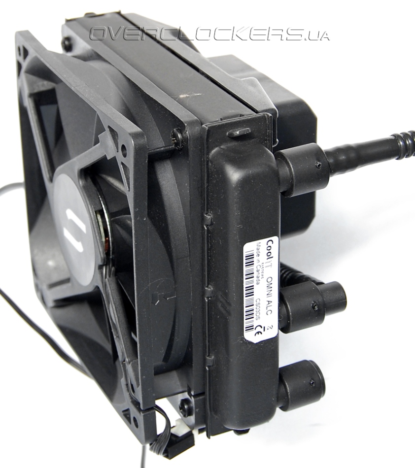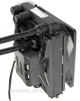 Помпа расположена прямо на радиаторе. Высота всей конструкции составляет 85 мм. Это довольно много. В случае использования массивных кулеров для охлаждения GPU радиатор с помпой могут просто не поместиться между кулером и стенкой. Так, в корпусе Chieftec CH-01B с материнской платой Gigabyte GA-X58A-UD3R (Intel X58 Express) данная СВО при установке вплотную упиралась в Thermalright Venomous X, а ведь это еще не самый массивный кулер для процессоров.