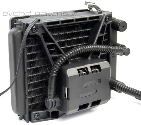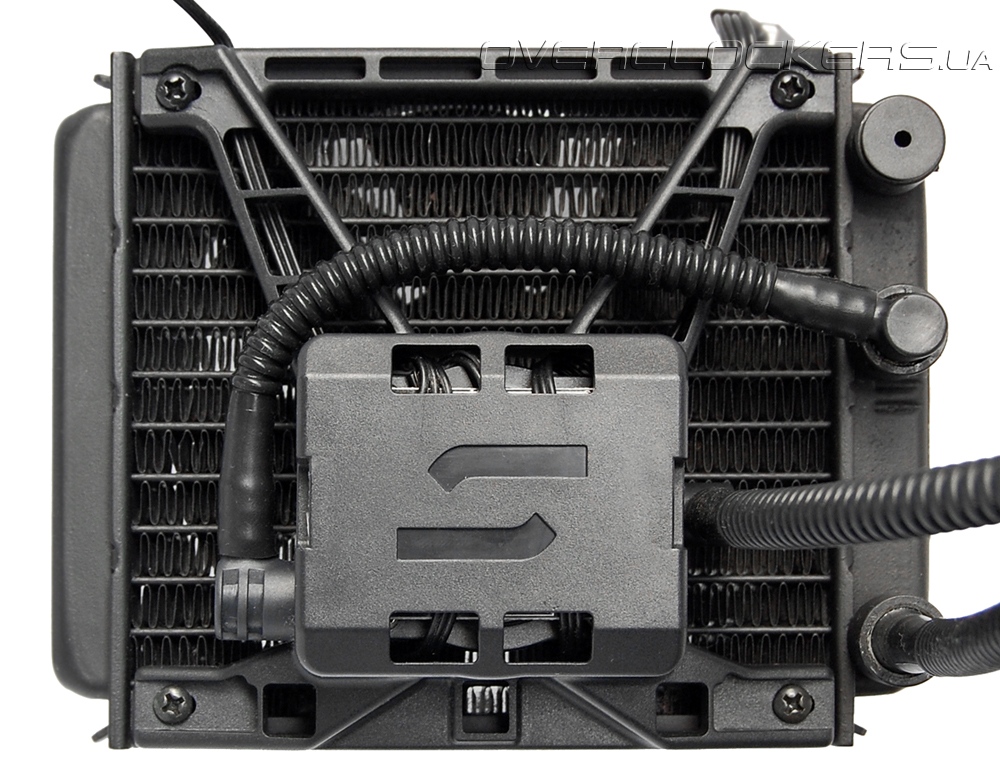 Совместная компоновка помпы и радиатора с точки зрения компактности — удачное решение, а с точки зрения продуваемости радиатора — не очень.