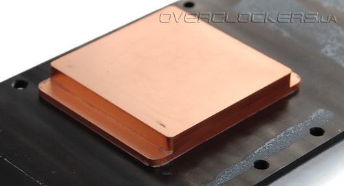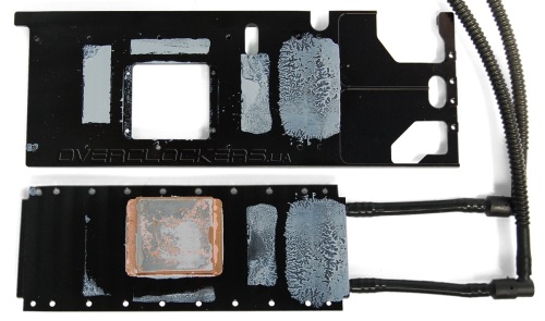 На самом деле водоблоком является лишь верхняя часть. Радиатор для VRM и микросхем памяти выполнен в виде отдельной массивной пластины, которая прикручивается к теплообменнику GPU. Это, конечно, проще и дешевле создания одного блока-охладителя, но эффективность будет сильно зависеть от контакта этих двух половинок. На деле же, как вы можете увидеть по нижнему фото, контакт в районе микросхем памяти не самый лучший. Но в наиболее критичной зоне системы питания, судя по отпечатку термоинтерфейса, он очень плотный.
