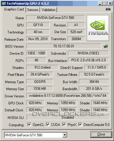 Вместо стандартных 772/1544 МГц для ядра и 4008 МГц для памяти GeForce GTX 580 Black работает на частотах 820/1640/4200 МГц. Для продукта high-end уровня это очень даже неплохой заводской разгон. К примеру, Zotac GTX 580 AMP! ограничивается частотами 810/1620/4100 МГц.