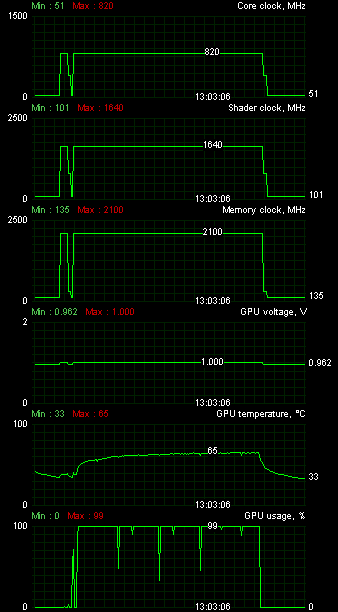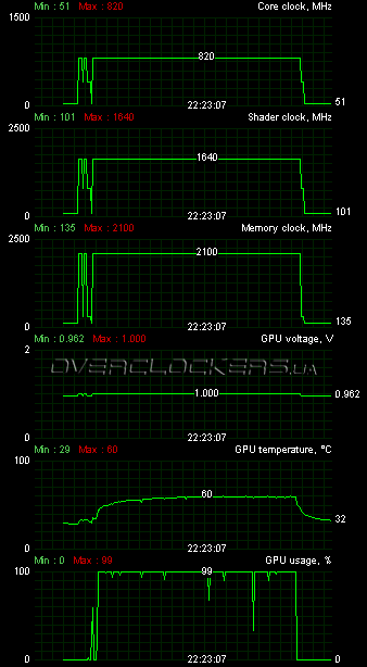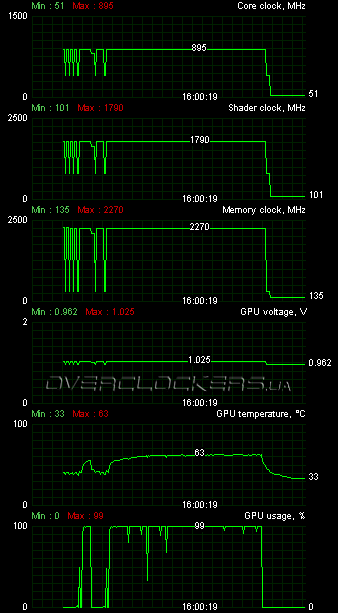 В таких условиях о приличном разгоне можно не думать. При максимальных оборотах вентилятора мы смогли достичь лишь 870/1740 МГц по ядру и 4540 МГц по памяти при дополнительном обдуве тихоходным 140-мм вентилятором. Относительно побывавших у нас ранее референсов от Zotac результат памяти вполне неплохой, а вот разгон GPU слабоват. Питающее напряжение ядра было повышено лишь до 1,013 В, большие значения помогли бы добиться стабильности на больших частотах, но карта при таких напряжениях быстро перегревалась. Хотя потенциал у GPU, судя по всему, был еще приличный.