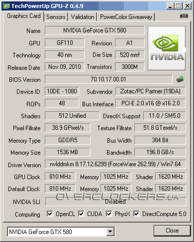 Не последнюю роль в росте тепловыделения сыграло и повышенное до 1,025 В напряжение. Упоминавшийся уже Zotac GeForce GTX 580 работал при 1,0 В.