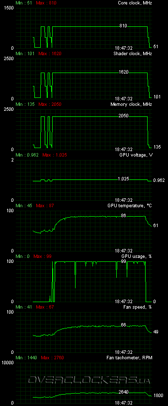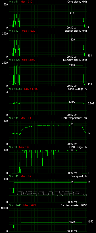 При нагрузке Crysis Warhead на максимальных настройках качества со сглаживанием AA4x в разрешении 1920x1200 температура ядра достигла 87 °С (при 23 градусах в помещении). Референсный Zotac, побывавший у нас ранее, грелся до 84 °С при температуре в помещении 22 °С. Кулер тоже оказался шумнее, потому что раскручивался до 2700 об/мин и выше.
