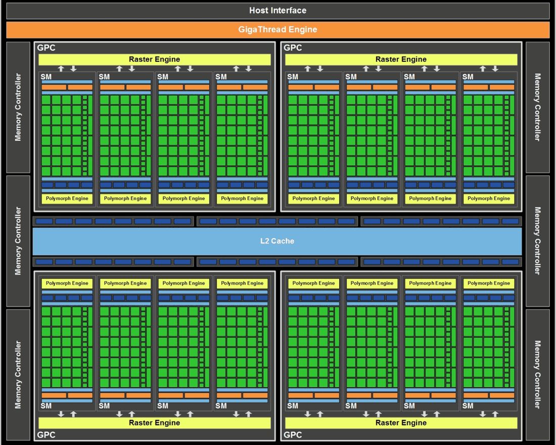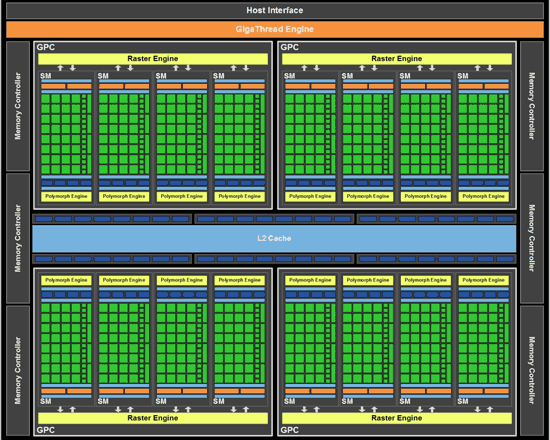 Новый графический ускоритель базируется на процессоре GF110, который является доработанной и усовершенствованной версией GF100. На первый взгляд, это полные близнецы, только у GF110 активны все мультипроцессоры (Streaming Multiprocessors), благодаря чему задействованы 512 CUDA-ядер, а не 480, как у старого чипа. Соответственно и число текстурных блоков (по четыре на один Streaming Multiprocessor) выросло с 60 до 64. Строение и организация мультипроцессорных блоков остались без изменений.