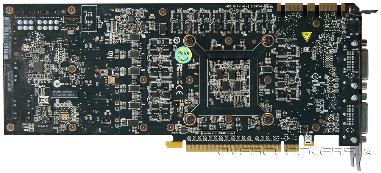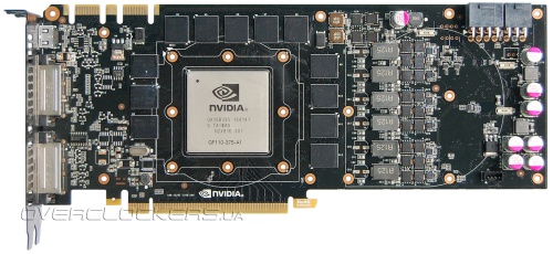 Дизайн платы полностью идентичен GeForce GTX 480. Исчезли только прорези в текстолите под вентилятором. Система питания памяти включает две фазы, ядра — шесть фаз под управлением контроллера CHiL CHL8266.