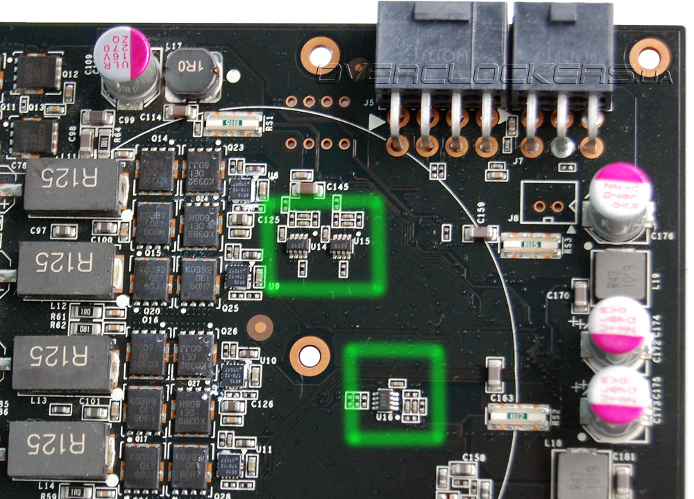 Реализован аппаратный мониторинг потребляемого тока от трех 12-вольтовых линий (слот PCI-Express и два разъема питания). Соответствующие микросхемы обведены зеленым на нижней фотографии.