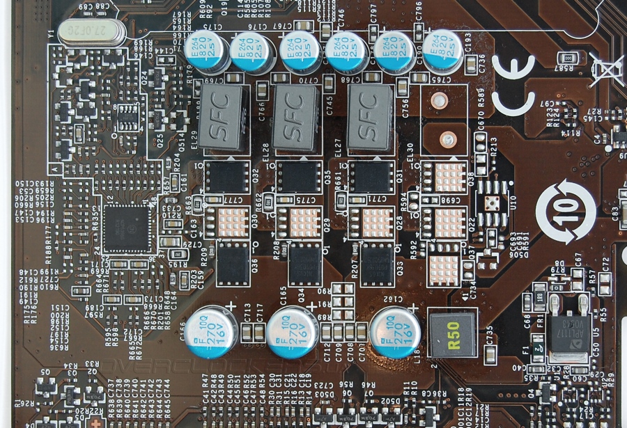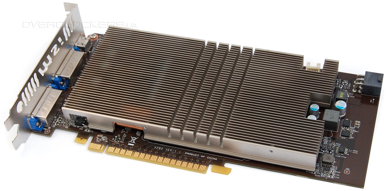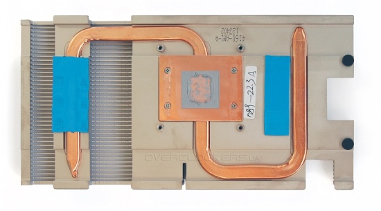 От процессора тепло отводится через медную вставку с одной изогнутой тепловой трубкой. Данная конструкция контактирует еще с силовыми элементами системы питания и двумя микросхемами памяти.