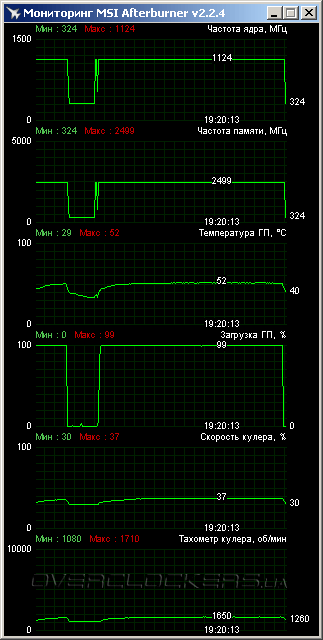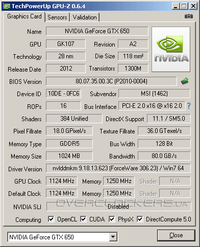 Рабочие частоты MSI — 1124/5000 МГц. Заводской разгон коснулся только GPU. В простое частоты снижаются до 324/648 МГц.