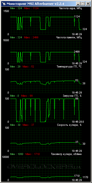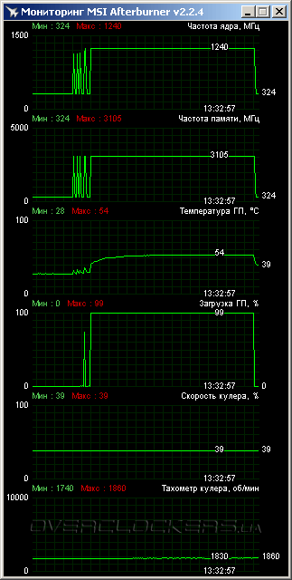 Самое приятное, что такой разгон не потребовал значительного повышения оборотов. Зафиксировав вентилятор на 39% (1830—1860 об/мин) мы легко прошли все тесты. Температура GPU достигала при этом лишь 54—55 °C. Просто отличный результат. С такими температурными показателями можно и вовсе не прибегать к ручной регулировке оборотов.