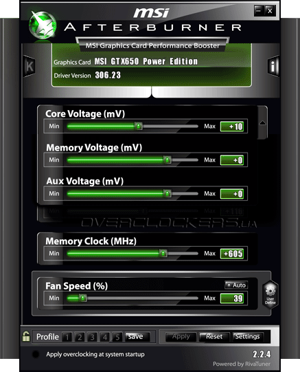 MSI N650 PE 1GD5/OC имеет расширенные возможности по управлению рабочими напряжениями. Для регулировки в утилите MSI Afterburner кроме напряжения GPU доступны Memory Voltage и AUX Voltage.