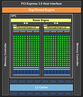 Данный чип состоит из одного кластера на два стандатных SMX-блока архитектуры Kepler. Общее число потоковых процессоров достигает 384, текстурных блоков 32, блоков растеризации 16, объем кэш-памяти L2 256 КБ. С видеопамятью сообщается при помощи двух 64-битных контроллеров.
