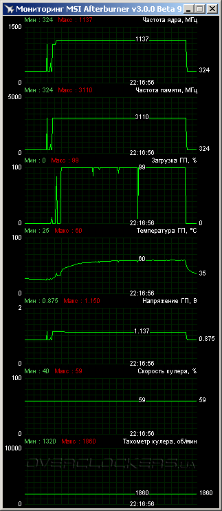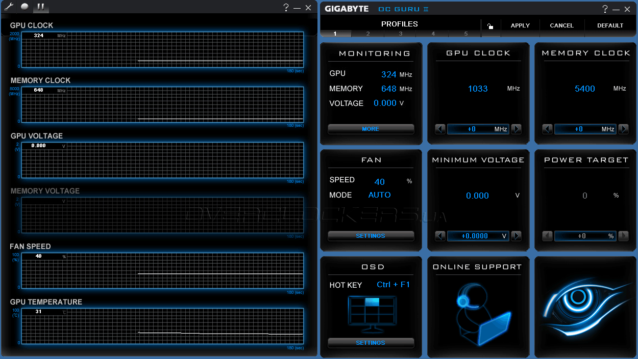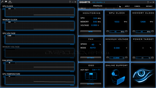 Для мониторинга и разгона мы задействовали MSI Afterburner, хотя для этих целей можно использовать и родную утилиту Gigabyte OC Guru II. Ее функционал сейчас не уступает другим приложениям, а внешний интерфейс стал более понятным и удобным.
