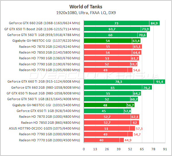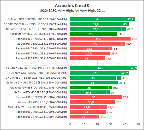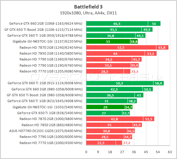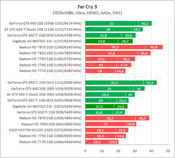 Простой GeForce GTX 650 Ti чуть слабее Radeon HD 7790 в Far Cry 3. У Gigabyte с соперником примерно один уровень. При разгоне Radeon оказывается лучше форсированного Gigabyte лишь при частоте ядра 1360 МГц.