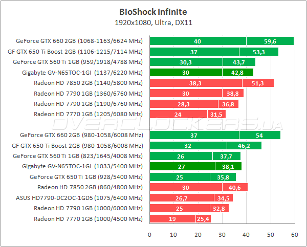 Отличные результаты в BioShock Infinite. Gigabyte на 6–8% лучше обычного GeForce GTX 650 Ti, быстрее GeForce GTX 560 Ti и слабее Radeon HD 7850 лишь на 6–11%.
