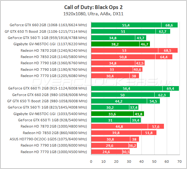 В Black Ops 2 у Gigabyte преимущество 14–15% над Radeon HD 7790 и 9–10% относительно ASUS HD7790-DC2OC. Разница с референсом — 6–8%.