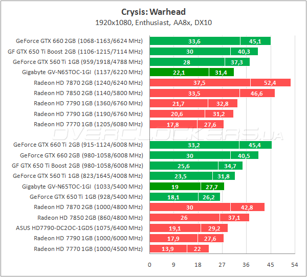 Gigabyte GV-N65TOC-1GI в Warhead лучше простого Radeon HD 7790, но чуть хуже ASUS HD7790-DC2OC по среднему fps. В разгоне Gigabyte лучше Radeon с простым разгоном. Конкурент при 1360/6760 МГц на 4% быстрее ускоренного Gigabyte, но все еще слабее по минимальному fps.