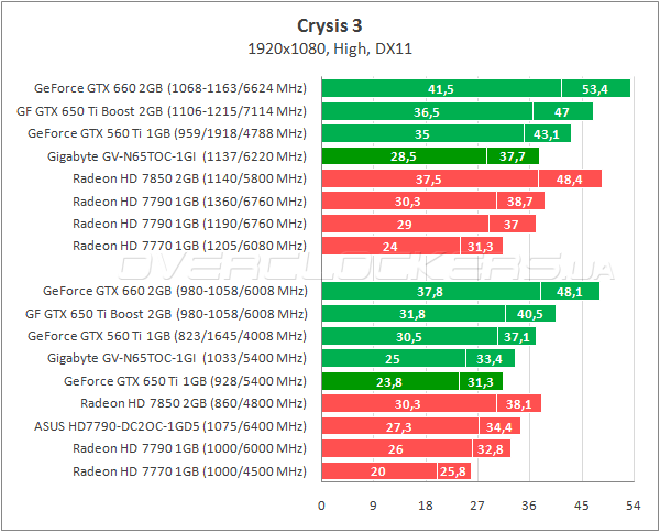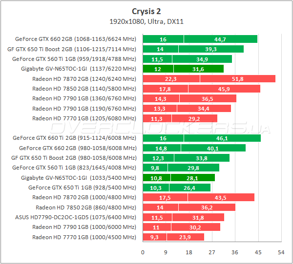 Немного сдает позиции герой обзора в Crysis 2, уступая уже простому Radeon HD 7790. При разгоне отставание от конкурента увеличивается.