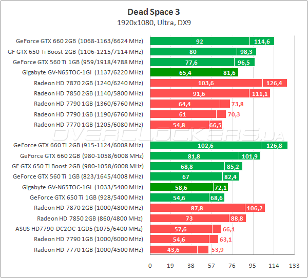 Повышенные частоты Gigabyte обеспечивают в Dead Space 3 преимущество над обоими версиями Radeon HD 7790 в номинале. При разгоне конкурент от AMD снова позади.