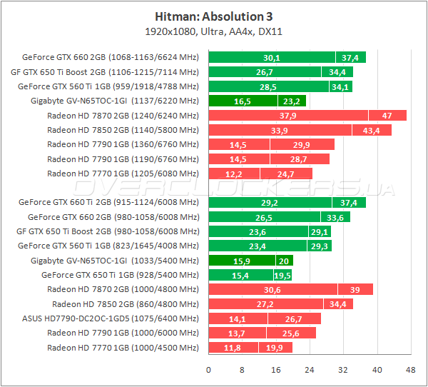 С Hitman при максимальном качестве GeForce GTX 650 Ti не справляется, демонстрируя очень низкие результаты. В номинале у Gigabyte средняя частота кадров сопоставима с fps на Radeon HD 7770, но по минимальному показателю он лучше ASUS HD 7790.