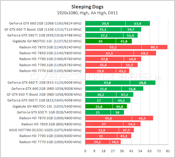 Представители AMD всегда демонстрировали лучшие результаты в Sleeping Dogs. В данном тесте мы видим, как Gigabyte уступает 11–16% простому Radeon HD 7790. Выйти на уровень конкурента удается лишь при разгоне до 1137/6220 МГц.