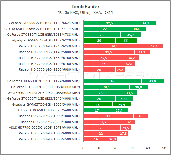 Неоднозначная ситуация в Tomb Raider. Средняя частота кадров у Gigabyte GV-N65TOC-1GI на одном уровне с ASUS HD7790-DC2OC, но просадки производительности больше, чем у простого Radeon HD 7790. При разгоне преимущество конкурента AMD по минимальному fps только усиливается.