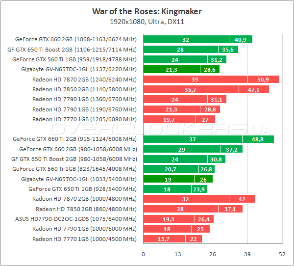 Еще одна непосильная для нашего героя игра при максимальном качестве графики. В War of the Roses разница между Gigabyte и ASUS лишь 1,5% в пользу представителя AMD. В разгоне ASUS удается обойти соперника лишь при частотах 1360/6760 МГц.