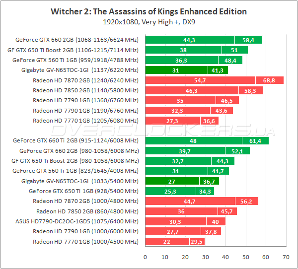 Во втором «Ведьмаке» без активации «запредельного качества» Gigabyte чуть проигрывает простому Radeon HD 7790 в номинале и в разгоне.