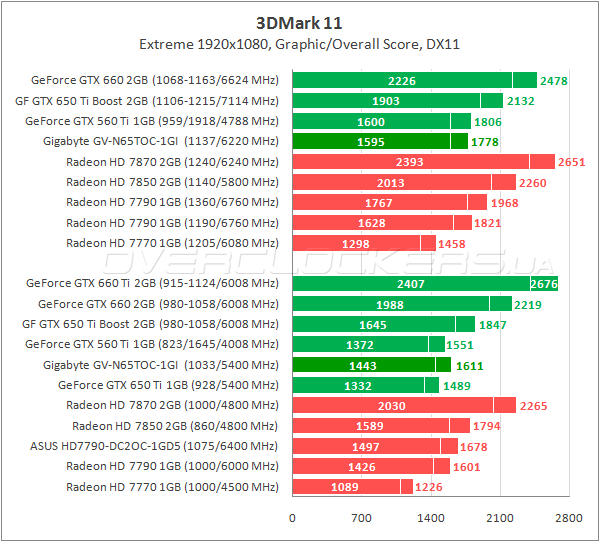 Gigabyte на 5–7% быстрее референса и на 11–22% слабее GeForce GTX 560 Ti. Простой Radeon HD 7790 выигрываете один кадр у Gigabyte по минимальному fps, но незначительно проигрывает по среднеигровому показателю. Примерно такой же паритет сохраняется и при обычном разгоне Radeon.