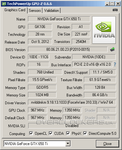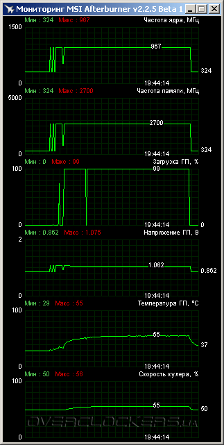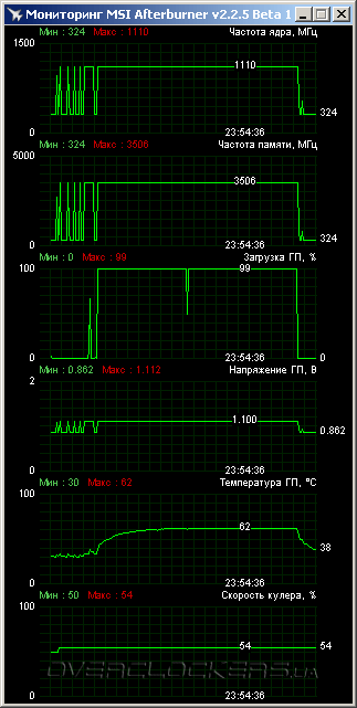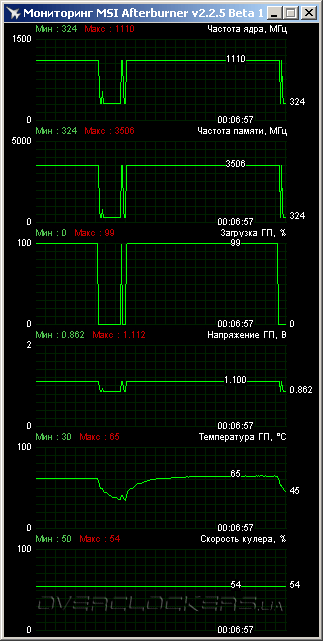 Обороты вентилятора мы не поднимали, лишь зафиксировали на отметке в 54%. В Crysis: Warhead температура возросла до 62 °C. В Kombustor графический чип грелся до 65 °C.